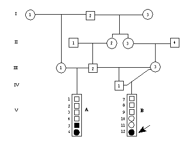 1 Hvad er indavlskoefficienten for individet X i nedenstående diagram?2 Beregn indavlskoefficienten for samtlige individer i følgende diagram: Dyr Far Mor Idet A=1 B=2 C=3 D=4 E=5 0=ukendt 1 0 0 2 1 0 3 1 2 4 3 2 5 3 4 3 På grundlag af nedenstående stamtavle ønskes følgende spørgsmål besvaret: a) Opstil et pilediagram for individet A. b) Beregn indavlsgraden for alle indavlede individer. 4 Betragt følgende to stamtavler. a) Hvem er fælles ane for Wahl 239 og ko nr. 196? b) Hvor stor bliver indavlskoefficienten på en kalv efter Wahl 239 og ko nr. 196? c) Kan det anbefales at bruge tyren Wahl 239 ved insemination af ko nr. 196? 5 På basis af nedenstående stamtavler for mink ønskes følgende spørgsmål besvaret: a) Angiv hvilke dyr, der er indavlede. b) Opstil pilediagram og beregn indavlskoefficienten for afkom efter IV A og IV B. 6 I nedenanførte stamtavle er de oprindelige betegnelser for de enkelte individer erstattet med numrene 1 til 11. Beregn indavlskoefficienten for dyr nr. 10 og 11, og beregn det additive slægtskab mellem dyr nr. 11 og de øvrige dyr i stamtavlen. 7 I nedenanførte genealogiske diagram repræsenterer V 12 (probant) den først erkendte schæfer-dværg i Danmark. Denne dværgvækst nedarves som en autosomal, recessiv egenskab. a) Angiv de individer, der med sikkerhed må være heterozygotiske anlægsbærere. b) Hvor stor er sandsynligheden for, at en tilfældigt udtaget phenotypisk normal hvalp i et af de to kuld (A eller B) i generation V er heterozygotisk anlægsbærer for dværgvækst? c) Hvor stor er indavlsgraden for 1) en tilfældigt udtaget hvalp i kuld A, og for 2) en tilfældigt udtaget hvalp i kuld B? d) Hvor stor er slægtskabskoefficienten mellem to tilfældigt udtagne hvalpe i kuld A? 8 På en minkfarm er der 100 avlsdyr, af hvilke 60 er ubeslægtede, otte er afkom efter helsøskendeavl, og 32 er afkom efter halvsøskendeavl. Beregn den gennemsnitlige indavlsgrad for de 100 avlsdyr.